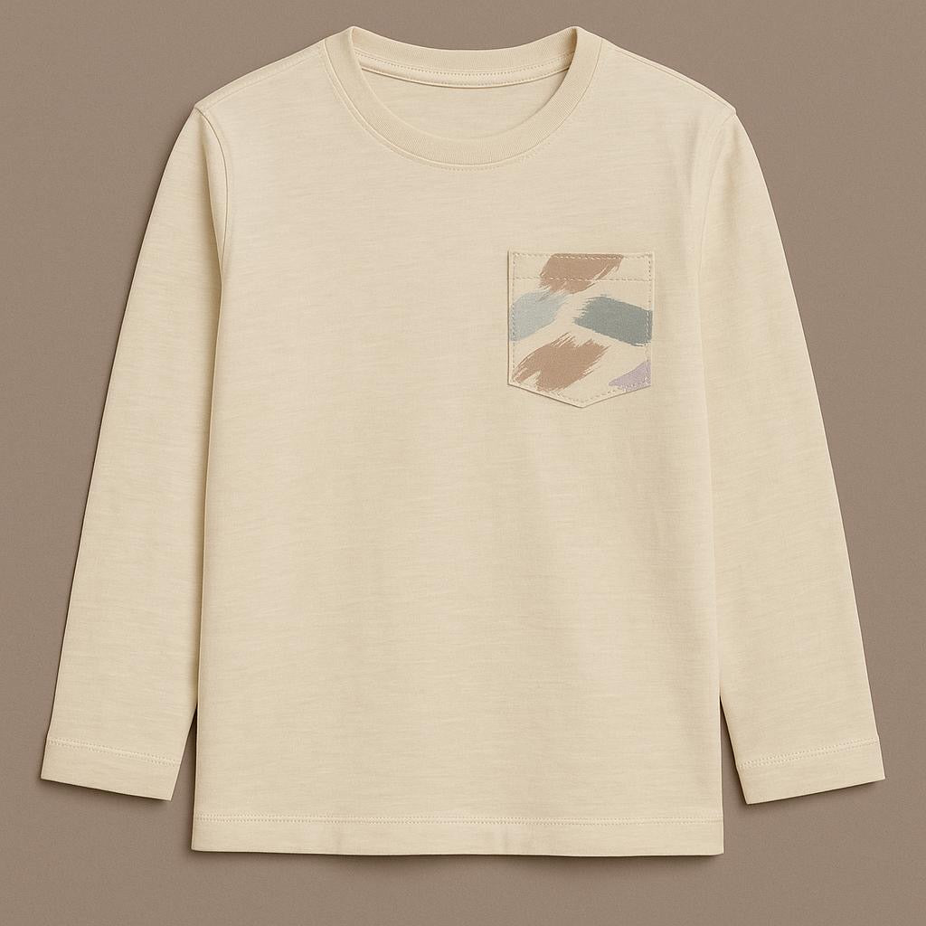 Add a touch of effortless style to your little one’s wardrobe with the Astro Long Sleeve Tee. Made from ultra-soft cotton, this cream-colored top is both comfortable and versatile for everyday wear. The standout feature is a stylish chest pocket with a multicolor abstract brushstroke design that adds a playful and artistic flair. Perfect for layering or wearing solo, it pairs easily with jeans, joggers, or shorts.