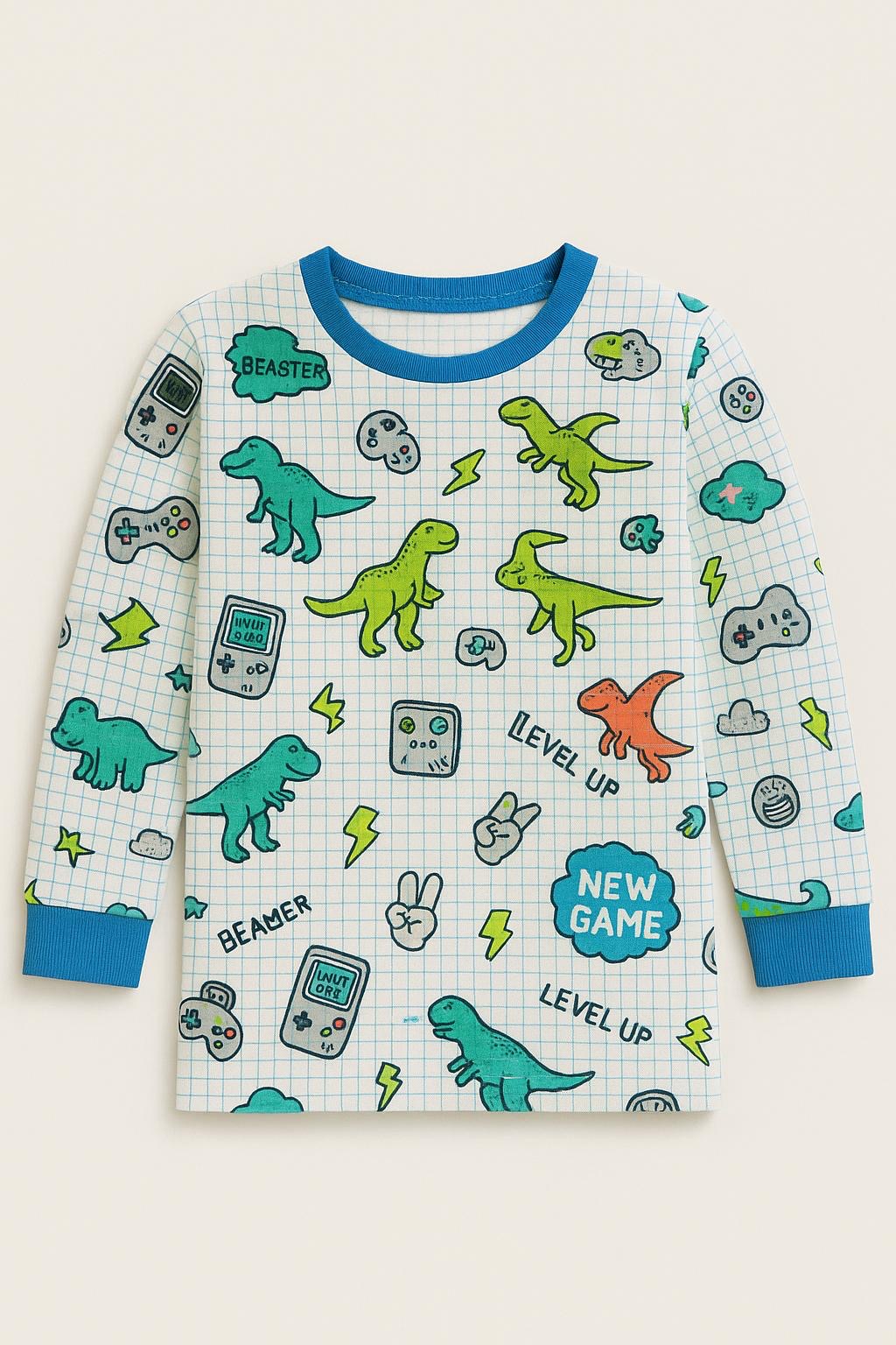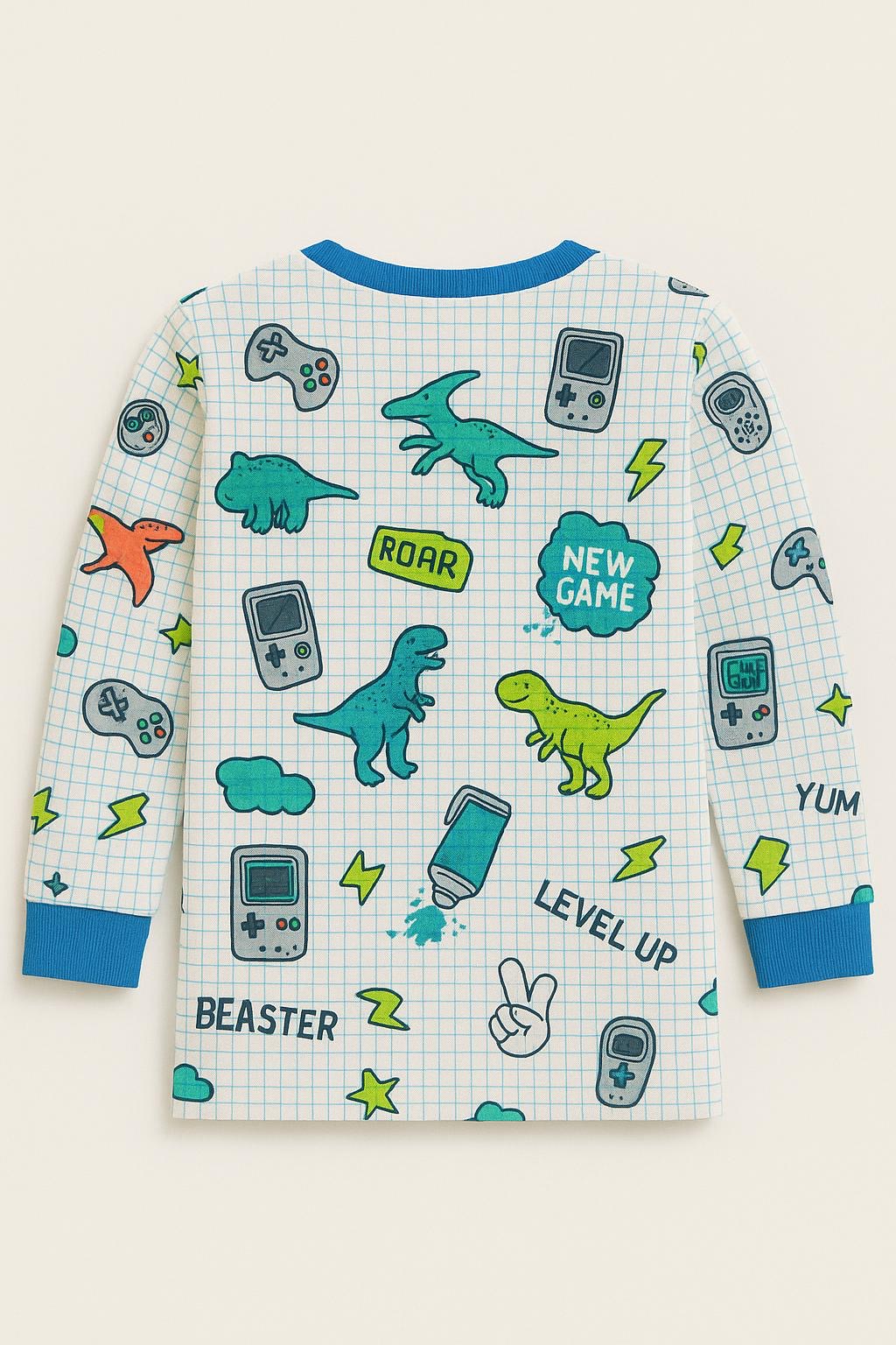 Dino Gamer Long Sleeve Tee – Multicolor | Kids Graphic Print Top
