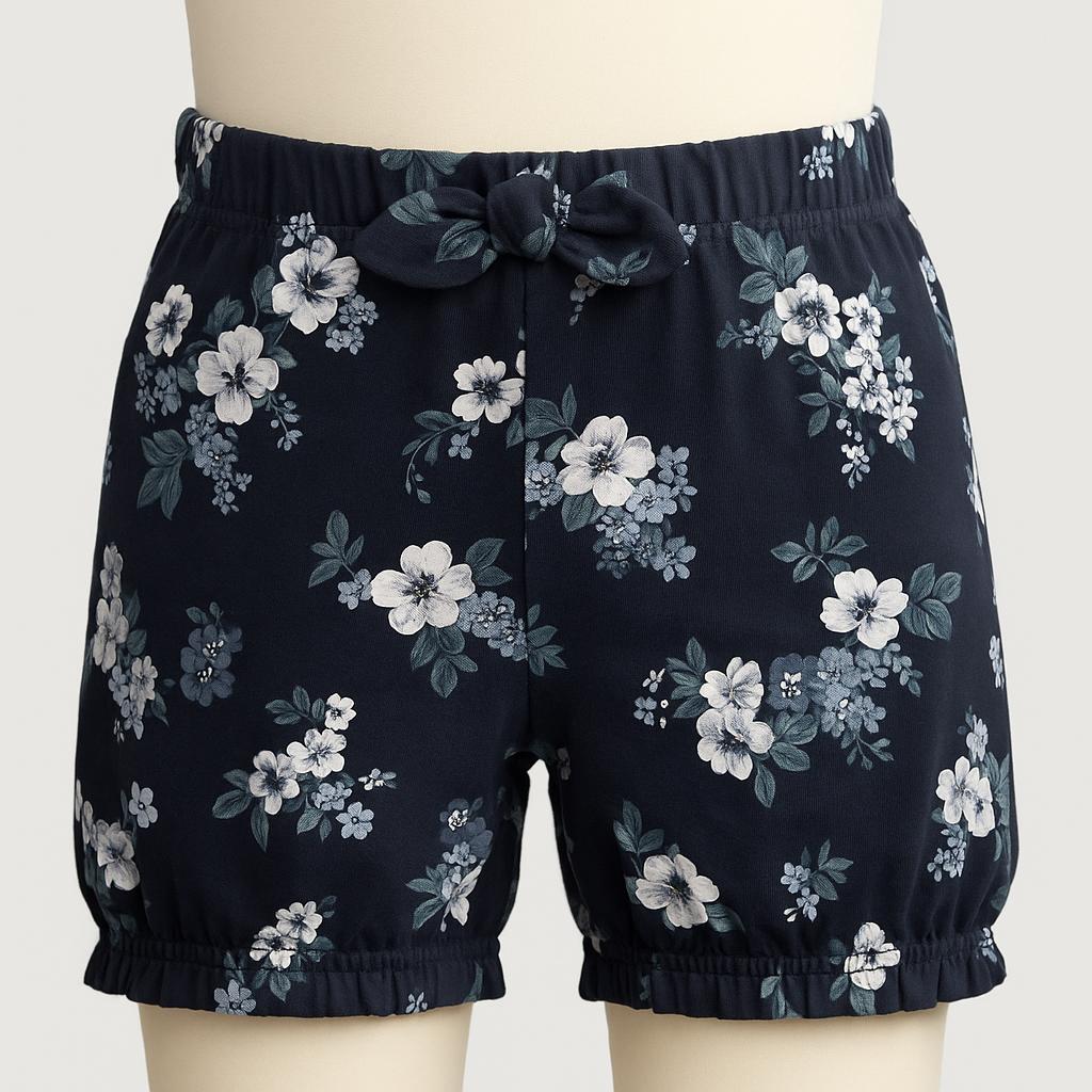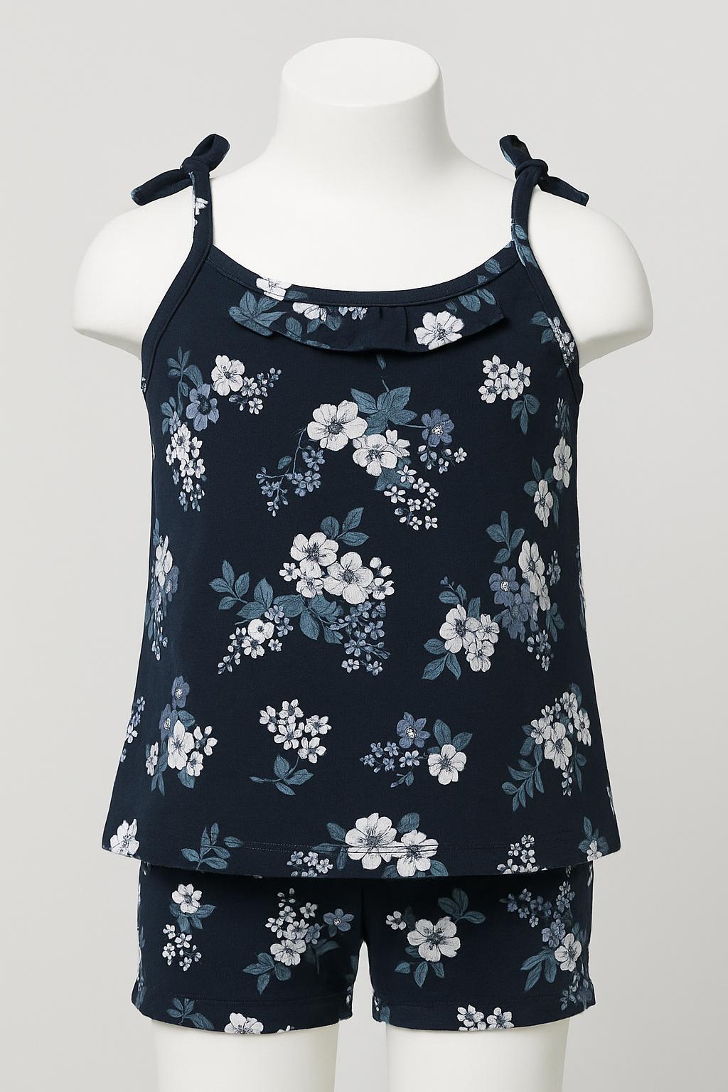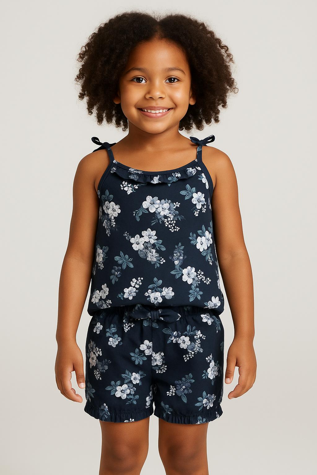 This adorable two-piece summer short set is perfect for sunny days and playful adventures. Featuring a charming floral print on a deep navy background, the set includes a lightweight, sleeveless top with delicate ruffle detailing along the neckline and adjustable shoulder ties for a perfect fit. The matching shorts are designed with a comfortable elastic waistband and a decorative bow, offering both style and ease of movement. Made from breathable, high-quality fabric, this outfit is ideal for beach trips, picnics, or casual outings.
