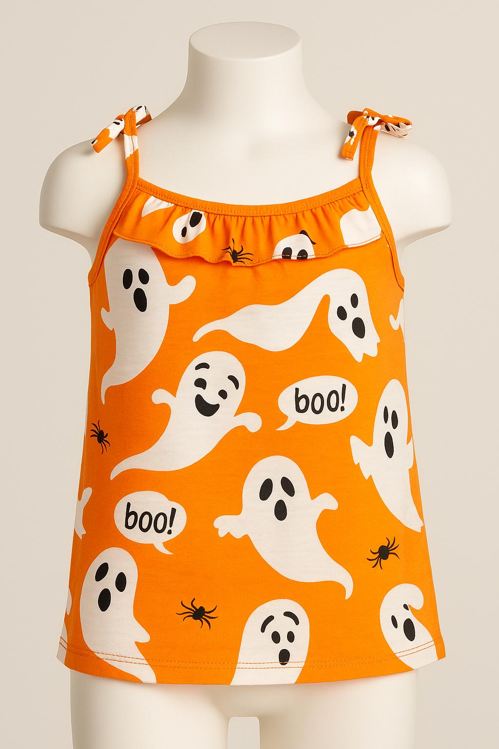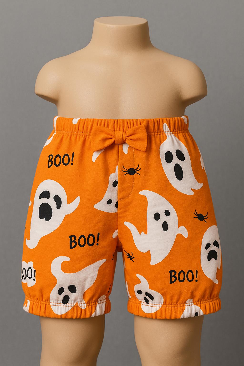 Covered in cute ghost prints, little spiders, and playful "BOO!" speech bubbles, it’s the perfect outfit for Halloween parties, dress-up days, or cozy autumn lounging.