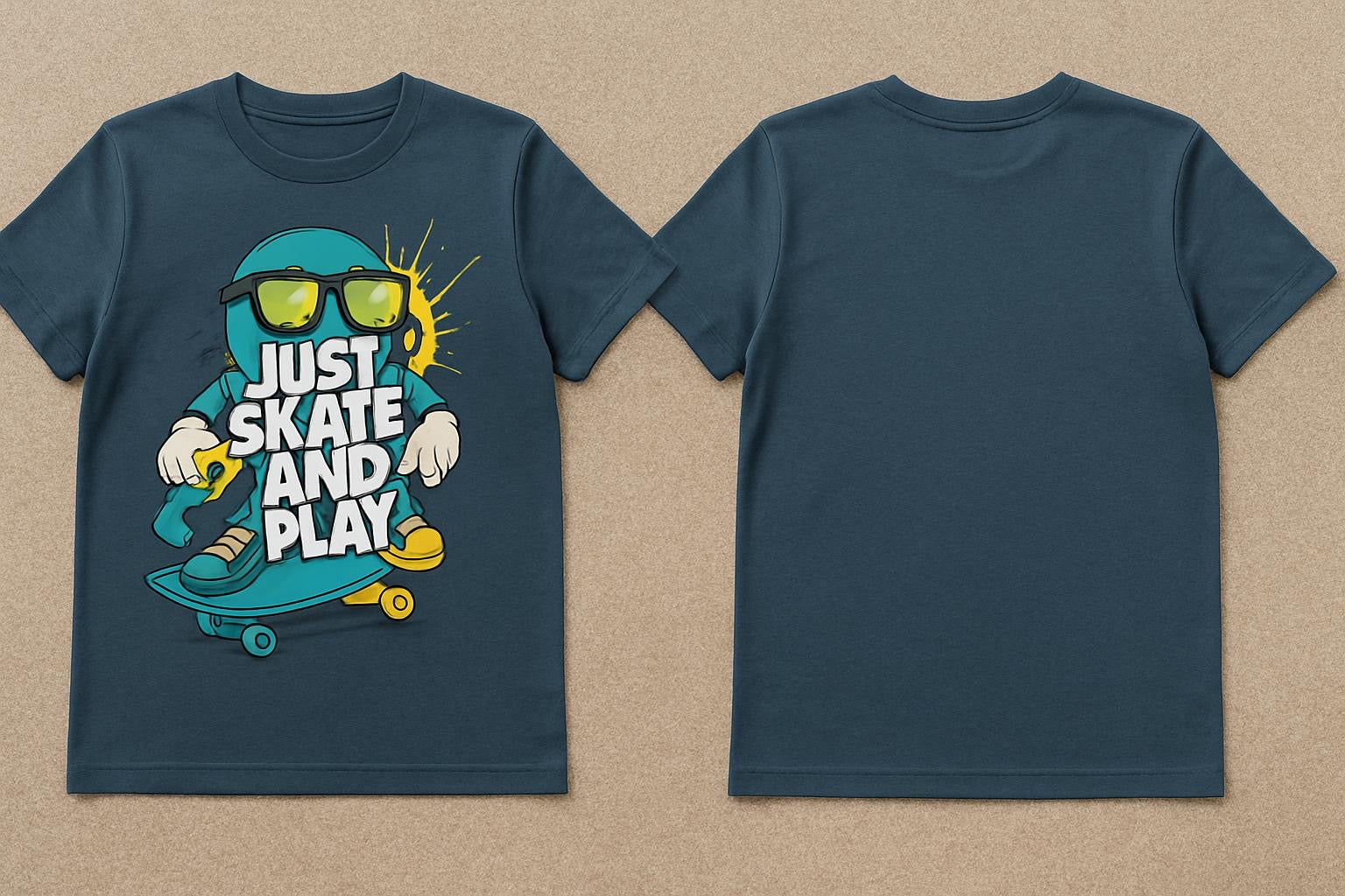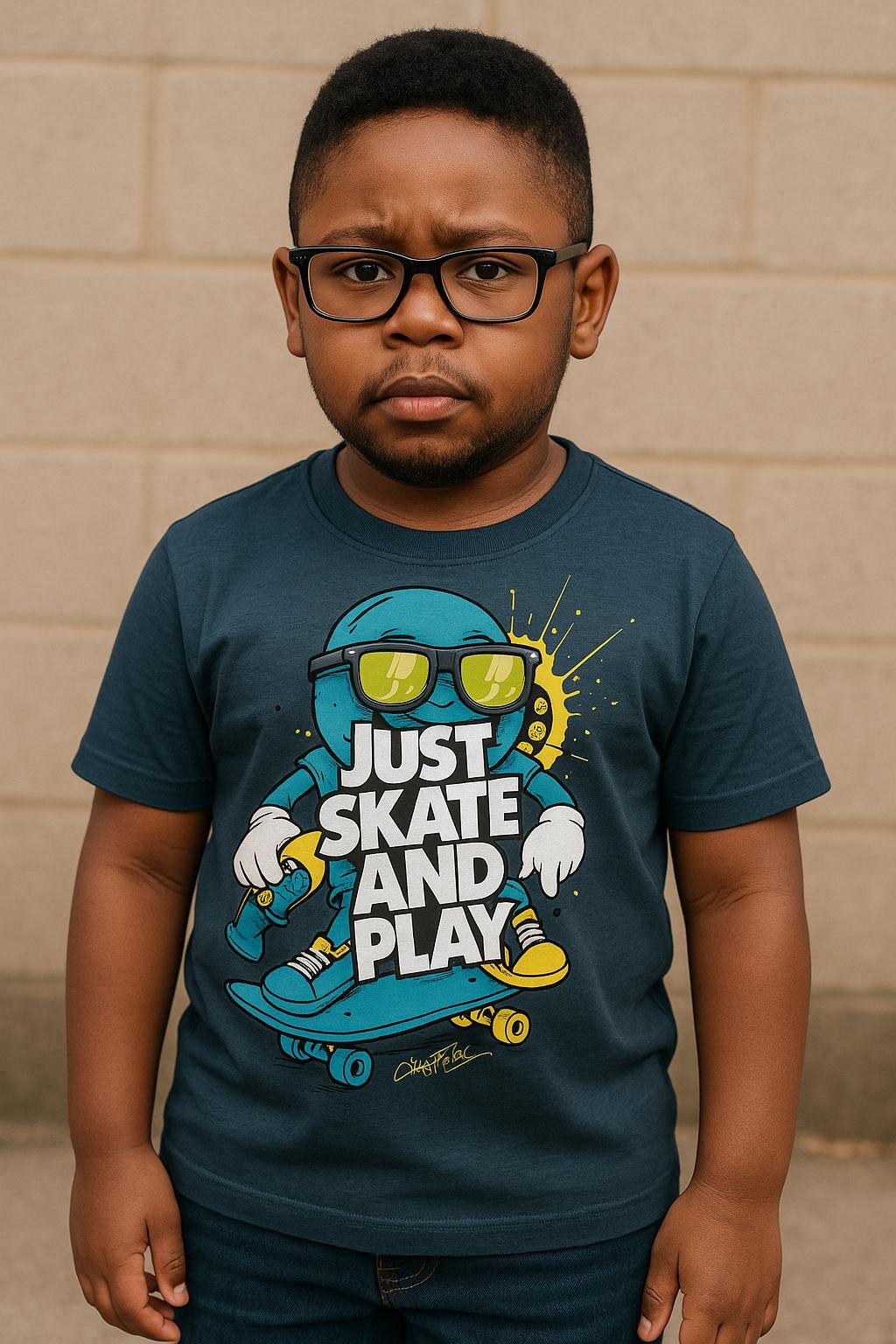 Bring bold personality and street style to your kid’s wardrobe with the Just Skate and Play T-Shirt in Deep Teal Blue. This graphic tee features a fun, animated skateboard design splashed with neon colors and the bold slogan “Just Skate and Play.” It’s perfect for young skaters, gamers, or any kid who’s all about having fun and standing out.