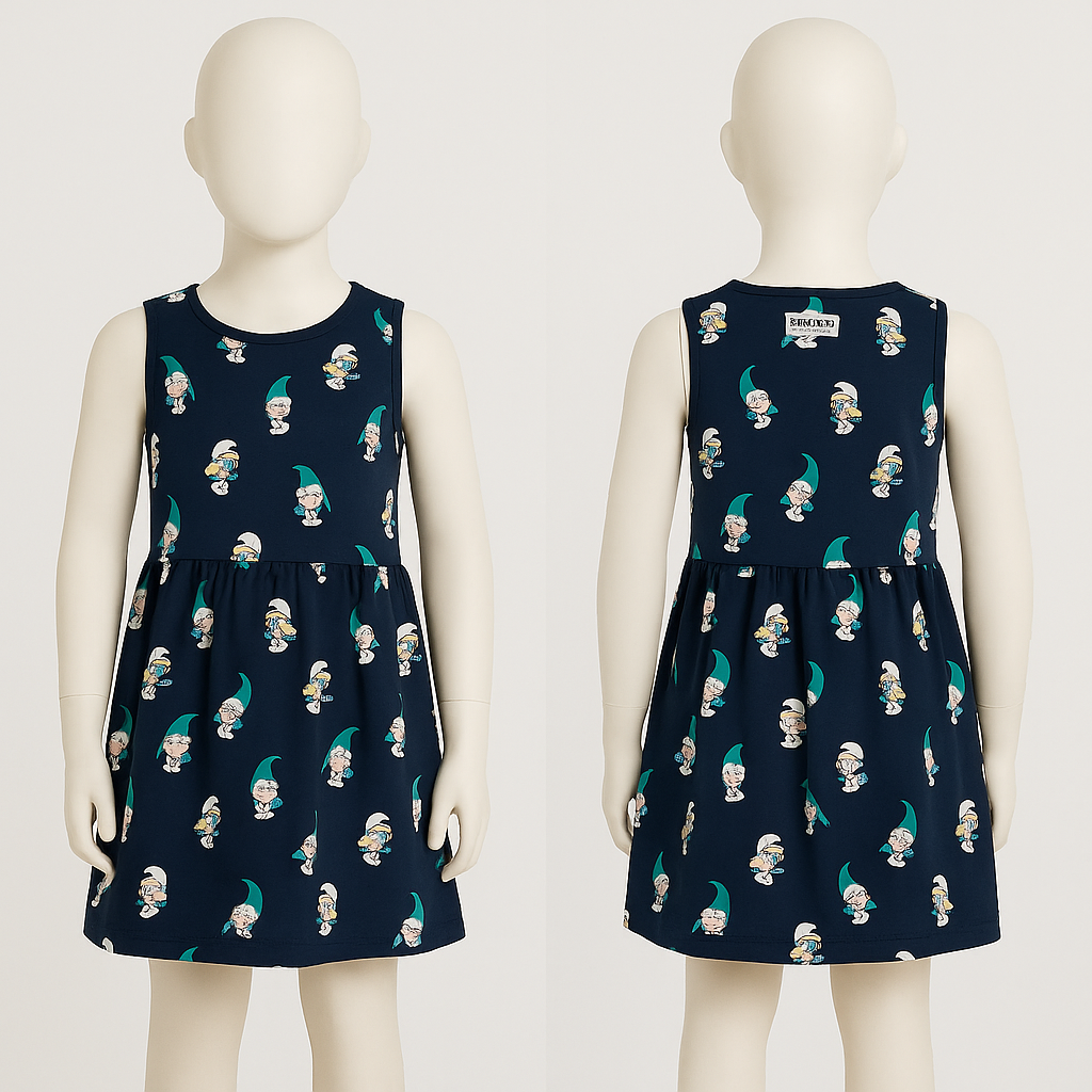 Bring a touch of nostalgia and a lot of fun to your little one’s wardrobe with this adorable NEXT Smurf Print Sleeveless Dress. Featuring an allover print of classic Smurf characters on a rich navy blue background, this dress is a playful blend of comfort and cartoon charm. The sleeveless cut and gently gathered skirt make it perfect for sunny days, casual outings, or themed events.